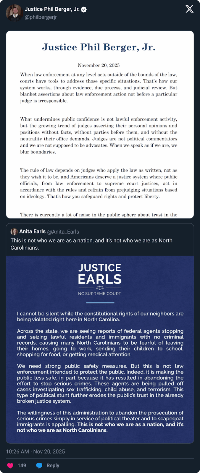 Yet fellow-Republican Phil Berger Jr. took to X/Twitter to publicly condemn not Newby, but liberal Justice Anita Earls. Her offense? Speaking plainly about unlawful and inhumane immigration enforcement tactics in North Carolina. “I cannot be silent while the constitutional rights of our neighbors are being violated,” Earls wrote. This was too much for Berger, who said, without irony, that Earls’s statement risks “undermining public confidence” in the courts and that the “rule of law depends on judges who apply the law as written, not as they wish it to be.”